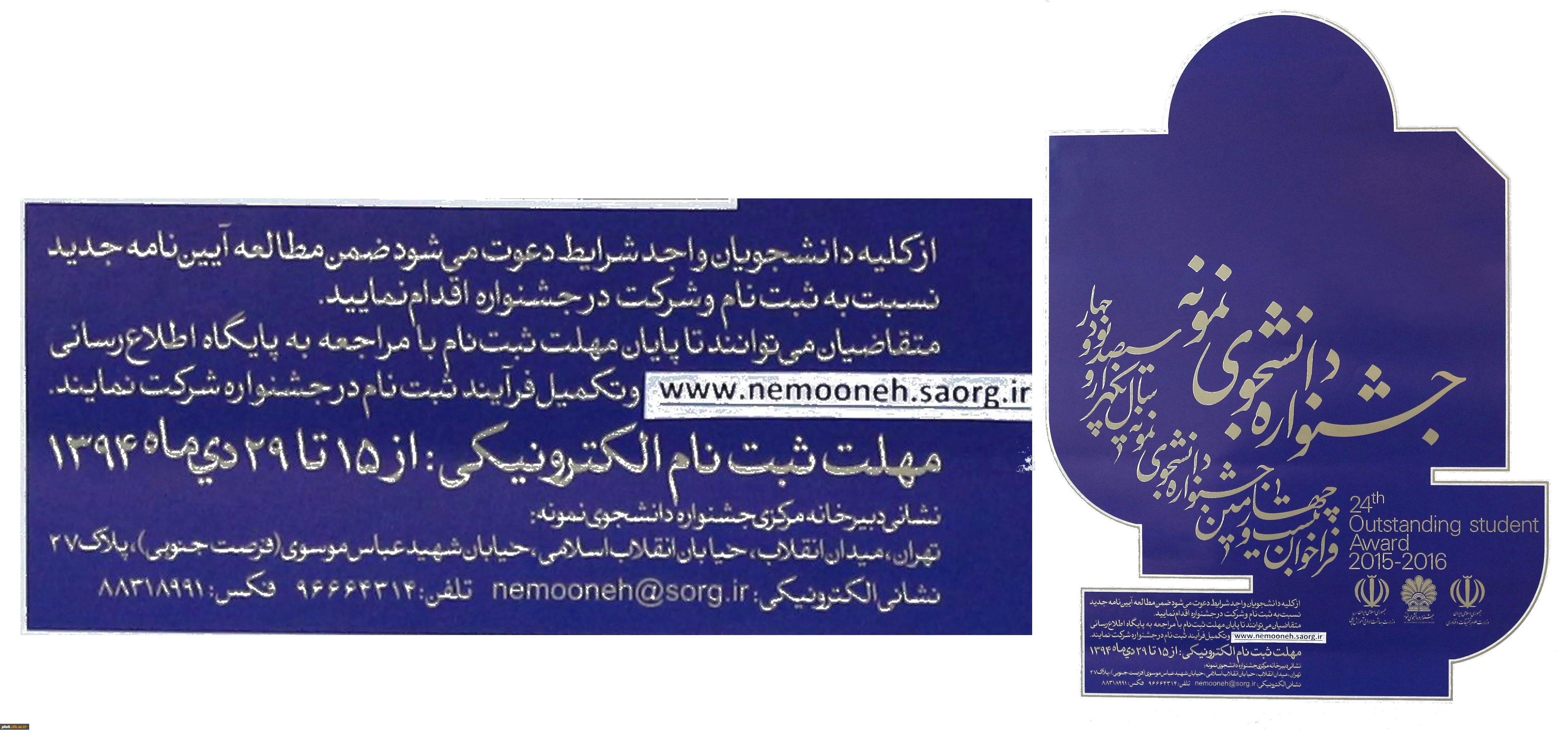 امتیاز دهید : برای اطلاعات بیشتر به سایت www.nemooneh.saorg.ir مراجعه نمایید. چهارشنبه 23 دی 1394 ساعت 7:45