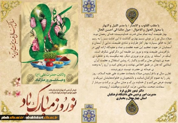 پیام تبریک دکتر تیمور نظری فرد مدیریت محترم امور پردیس های استان به مناسبت میلاد حضرت علی(ع)، روز پدر و فرا رسیدن نوروز 2