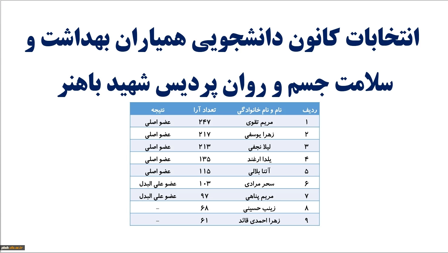 نتایج آرا انتخابات کانون دانشجویی همیاران بهداشت و سلامت جسم و روان پردیس شهید باهنر شهرکرد 2