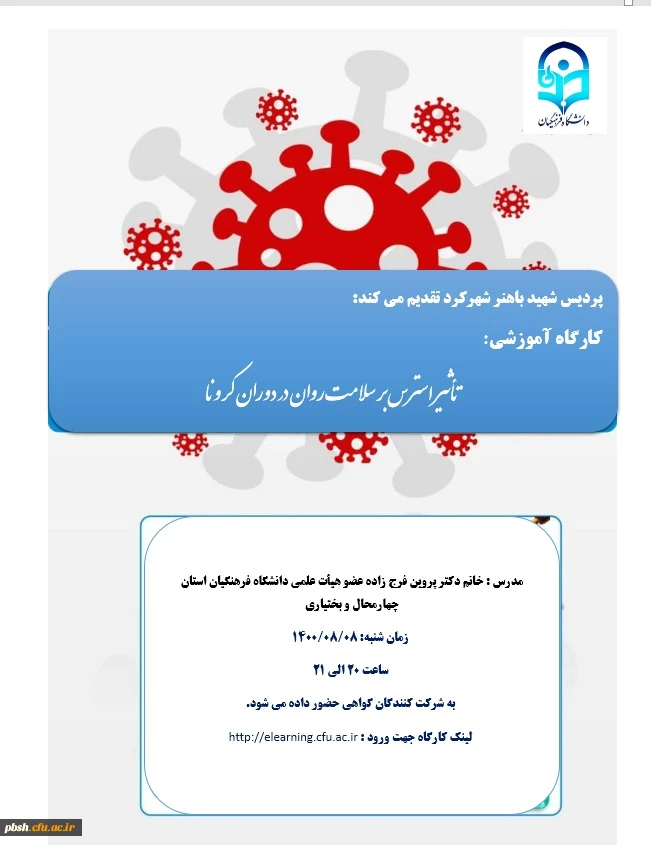 امتیاز دهید : کارگاه تاثیر استرس بر سلامت روان در دوران کرونا(مدرس خانم دکتر فرج زاده) 2 چهارشنبه 19 آبان 1400 ساعت 11:45
