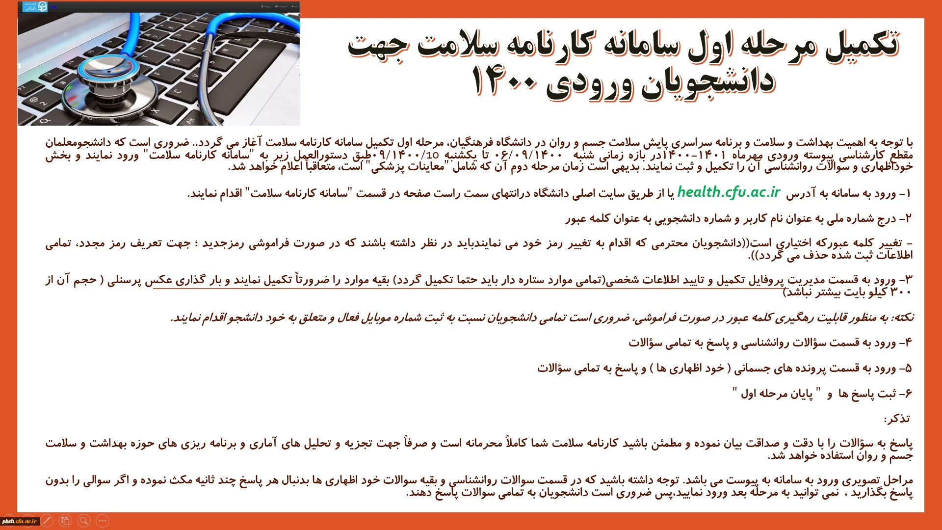 امتیاز دهید : تکمیل مرحله اول سامانه کارنامه سلامت جهت دانشجویان ورودی 1400 2 سهشنبه 2 آذر 1400 ساعت 10:36