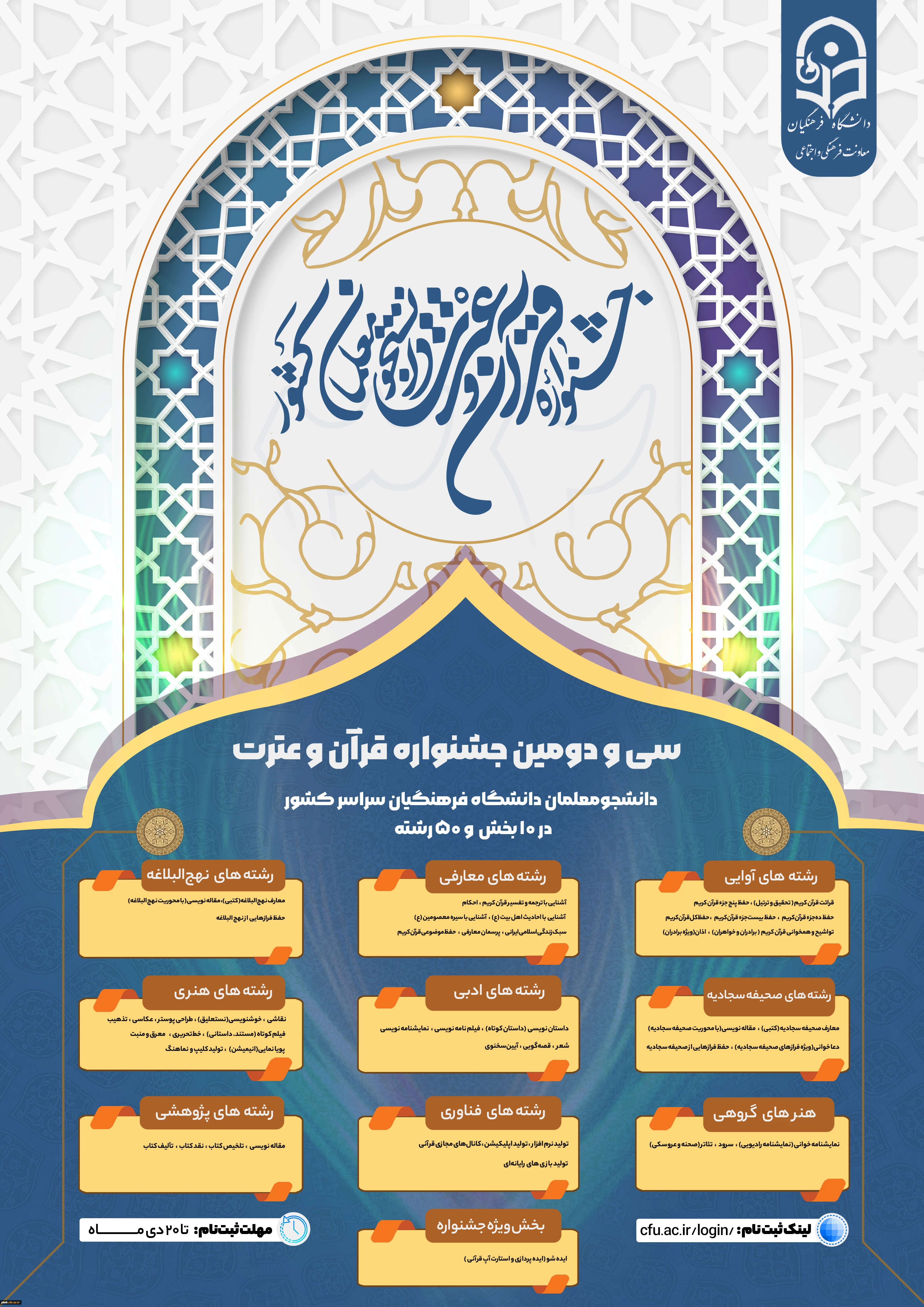 امتیاز دهید : فراخوان ثبت نام و شرکت در 32 مین جشنواره فرهنگی و اجتماعی دانشگاه فرهنگیان 2 شنبه 20 آذر 1400 ساعت 9:23