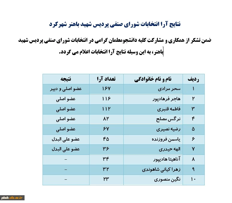 امتیاز دهید : نتایج آرا انتخابات شورای صنفی پردیس شهید باهنر شهرکرد 2 سهشنبه 10 خرداد 1401 ساعت 7:30